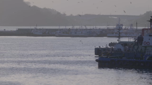 Fishing boats and seagulls anchored in a quiet harbor