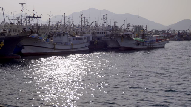 Fishing boats docked at a busy port