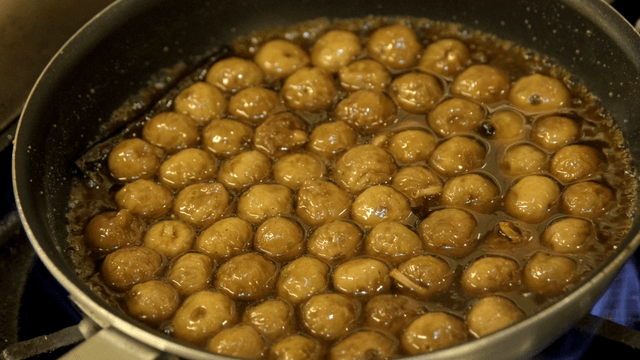 Pouring of dark chocolate syrup into a white bowl with a spoon