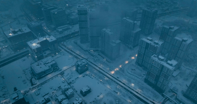 Snow-covered cityscape with high-rise buildings