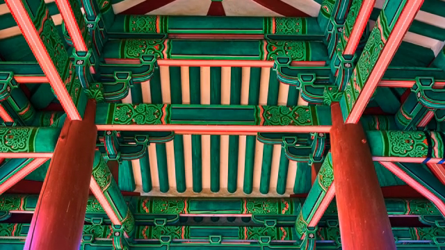 Traditional Korean temple ceiling with vibrant colors