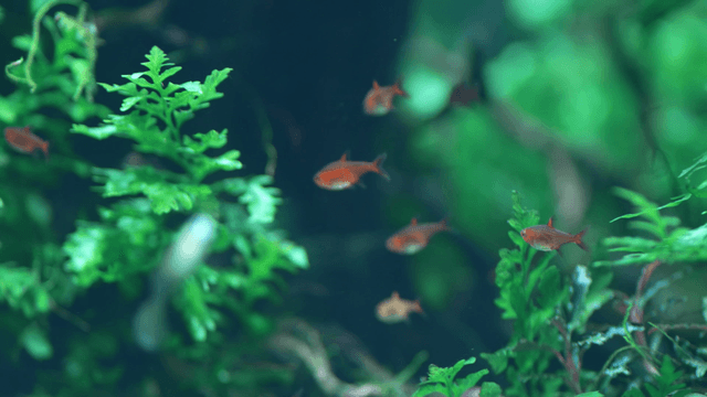 Colorful fish swimming among lush aquatic plants