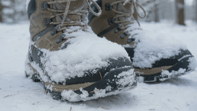 Boot stepping on snow in a forest