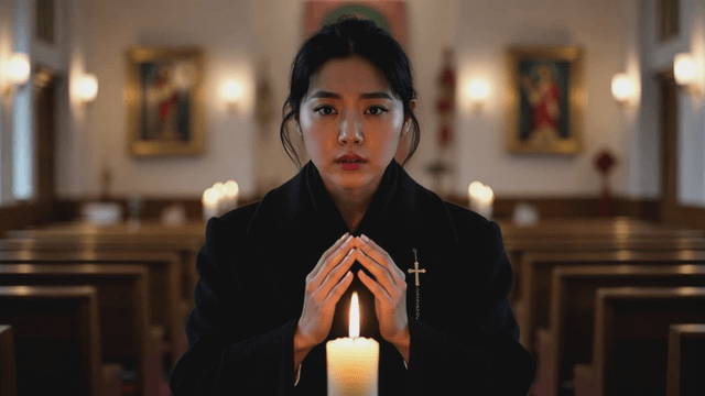 Nun praying in church lit by candlelight