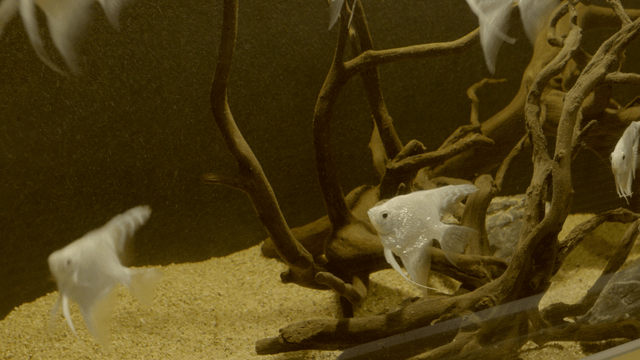 Tropical fish swimming among trees in fish tank