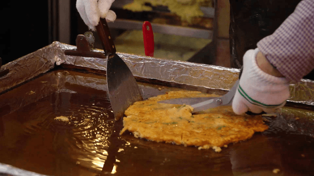 Crispy and savory mung bean pancakes grilled on an iron plate