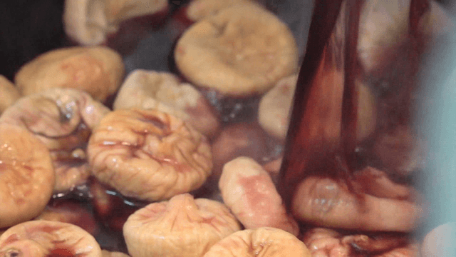 Red mulled wine poured over steaming dried figs