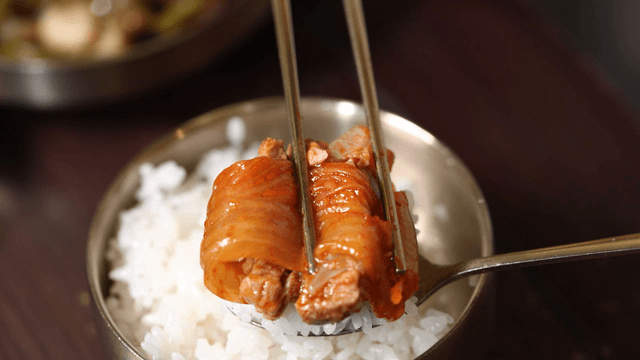 Table set with rice and kimchi stew topped with cherry tomatoes