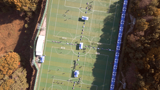 Aerial view of a sports field surrounded by forest