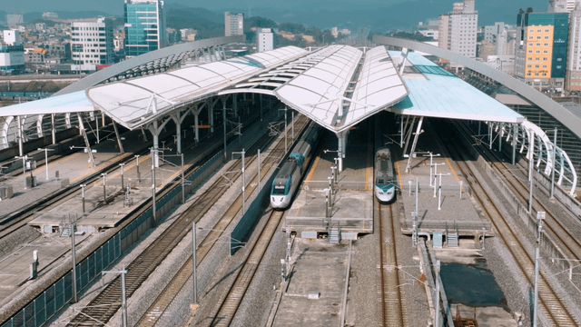 Aerial view of a modern train station