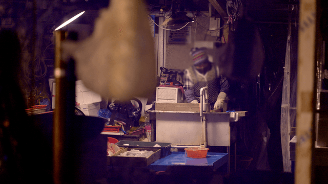 Person working at fish market stall