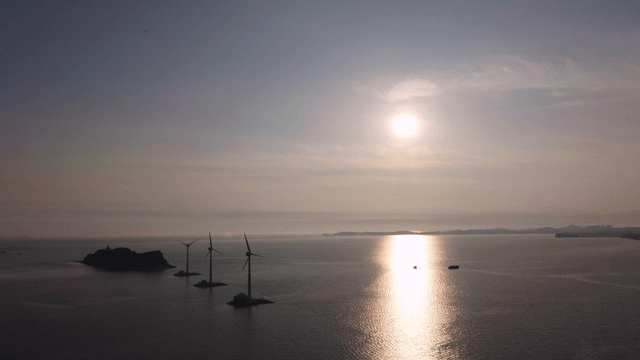 Wind turbines on sunlit sea