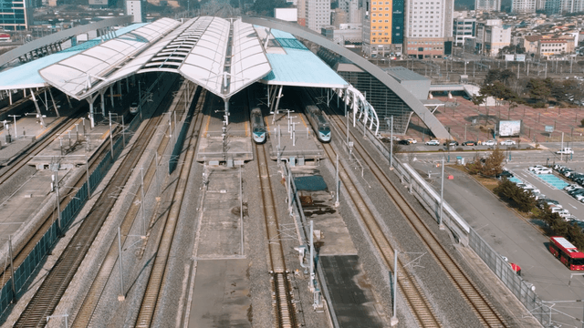 Aerial view of a modern train station