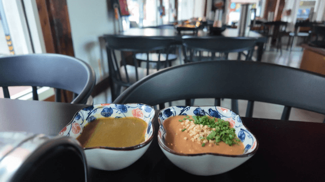 Chopsticks dipping meat into peanut sauce for cheese mala hot pot