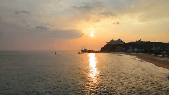 Sunset over a serene beach with a pier