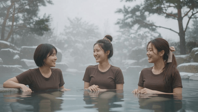 Women enjoying a hot spring in snowy scenery