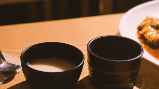 Warm seaweed soup with beef in a white soup bowl on a wooden table