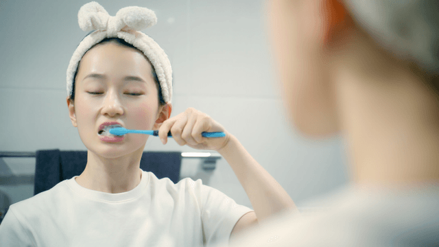 Woman brushing teeth in a bathroom mirror