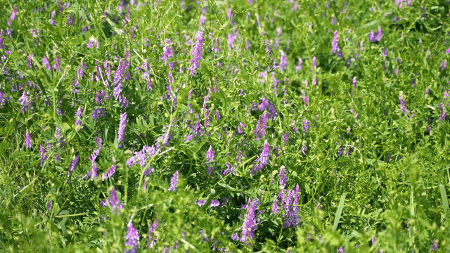 Bee flying over a field of purple wildflowers in full bloom on a sunny day