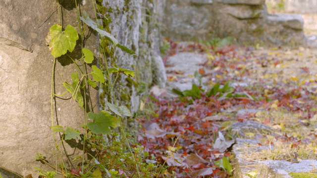 People walking on a leaf-covered path next to stone walls