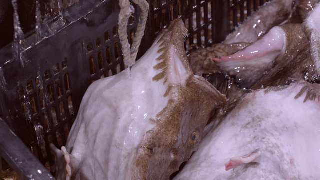 Fish being put into baskets on fish market floor