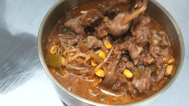 Pouring Broth into Bowl of Seolleongtang with Meat