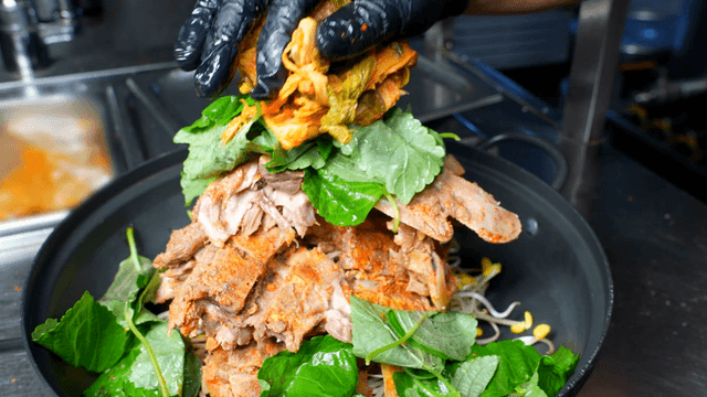 Pork backbone stew with perilla leaves and enoki mushrooms