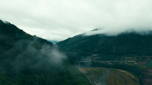 Misty mountains with a rural village