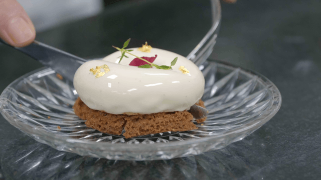Plate of strawberry-topped griddlecake with sugar filling and ice cream