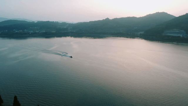 Dcked small boats on a calm Baegunhosu Lake on a sunny day