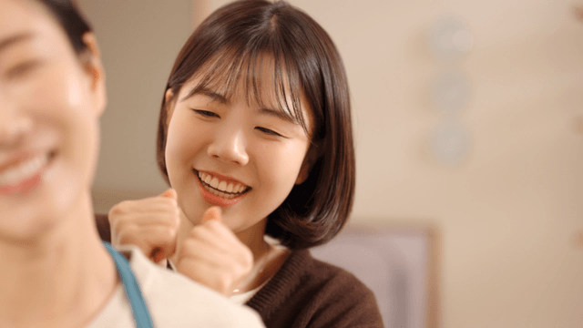 Daughter massaging mother's shoulders