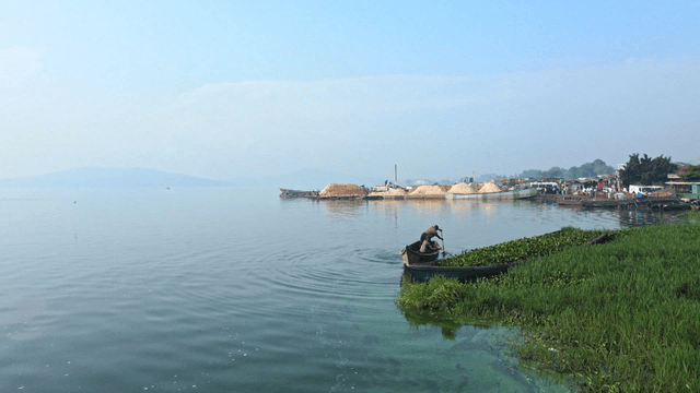Dcked small boats on a calm Baegunhosu Lake on a sunny day