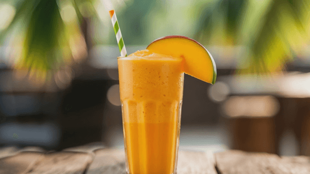 Refreshing mango smoothie on wooden table