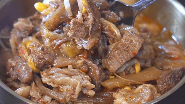 Bowl filled with meat poured with Korean beef soup