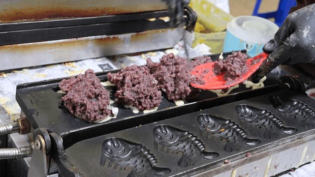 Preparing fish-shaped pastry with wheat batter and sweet red bean filling