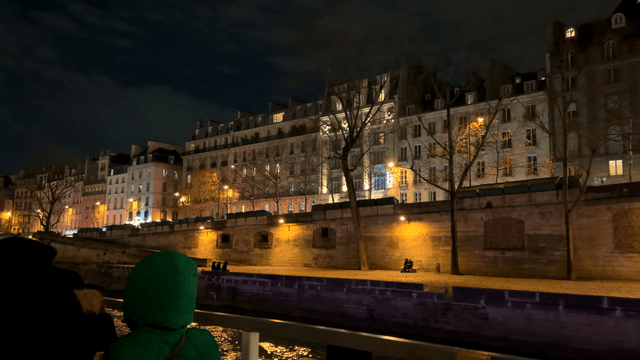 Night view of European city buildings lined up along riverbank seen from boat