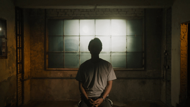 Person sitting alone in dark room with bars