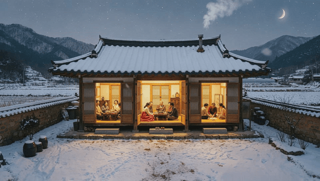 Family building a snowman in the courtyard of a snow-covered Korean house
