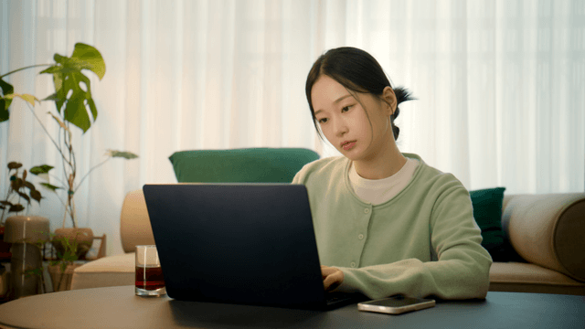Woman drinking coffee and looking at her phone while working on her laptop at home