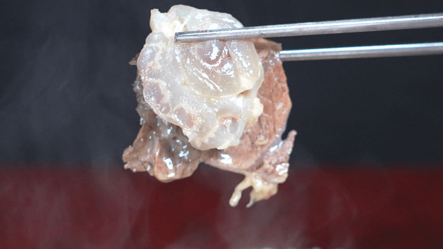 Braised pork backbone meat in clear soup picked up with chopsticks