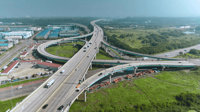 Aerial view of a busy highway interchange