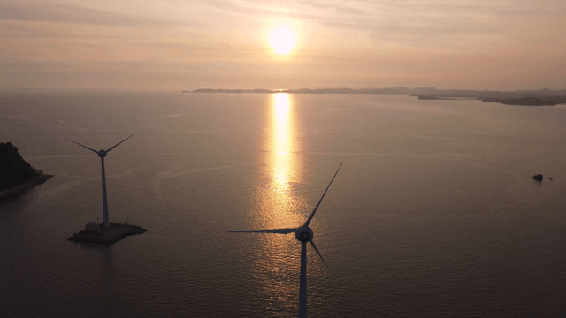 Wind turbines at sea in sunset sunlight