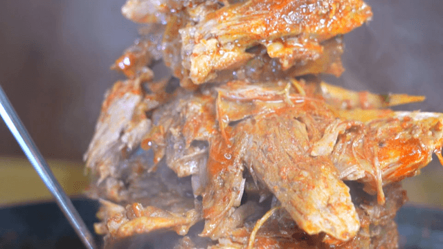 Ladle filled with generous pork back-bone meat from outer leaves stew