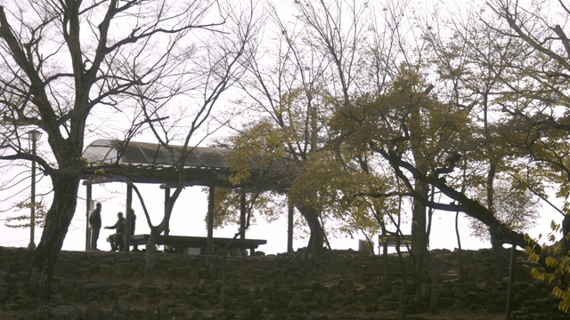 People gathered in pavilion under tree in forest