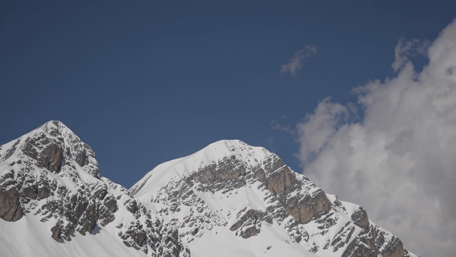 Snow-covered mountains under cloudy skies
