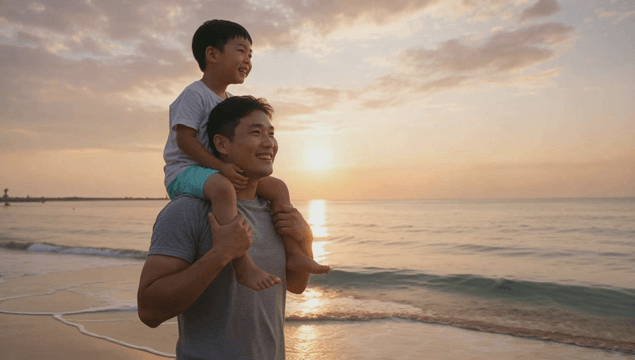Father and son enjoying a beach sunset
