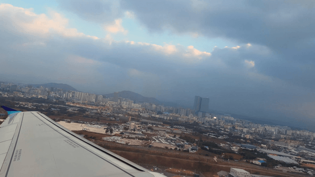 View from airplane window over cityscape