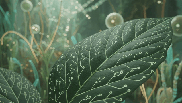 A leaf with digital circuit patterns