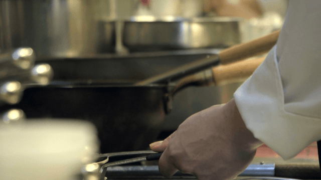 Chef moving pan with lid to the shelf