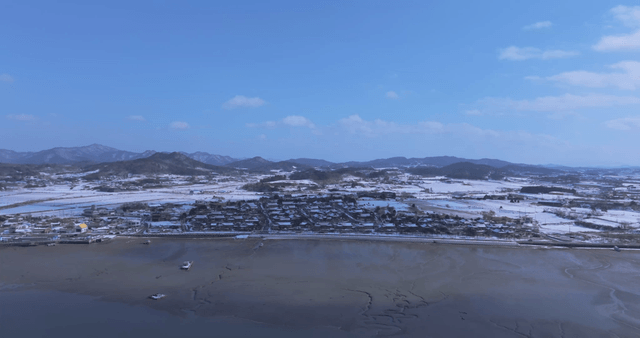 Snow-covered traditional Korean village next to tidal flat
